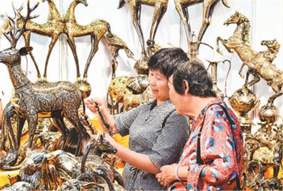 9月23日,在广西南宁举行的第十六届中国—东盟博览会上,“一带一路”相关国家的参展商带来的商品吸引众多参观者前来选购。图为参观者在南宁国际会展中心选购巴基斯坦青铜器。新华社记者曹祎铭摄