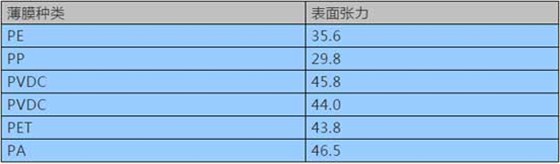 3、复合基材膜表面张力必须在38dyn/cm以上。各种塑料薄膜的表面张力如表1所示。