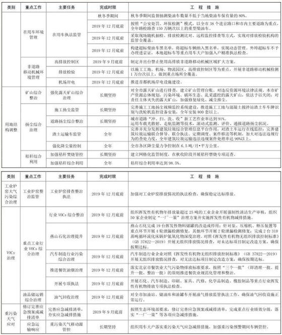 主要目标:稳中求进,推进环境空气质量持续改善,京津冀及周边地区全面完成2019年环境空气质量改善目标,协同控制温室气体排放,秋冬季期间(2019年10月1日至2020年3月31日)PM2.5平均浓度同比下降5.5%,重度及以上污染天数同比减少8%(详见附表1)。
