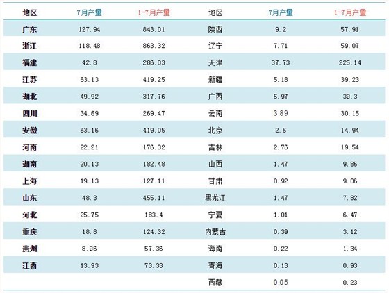 1-7月塑料制品累计产量排名前五位(广东、浙江、安徽、江苏和湖北)的总产量达到2862.39万吨,占到全国总产量53.8%。(按7月规模企业统计)