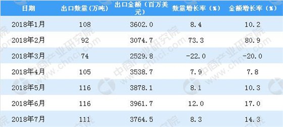 2018年1-7月中国塑料制品出口数量及金额增长率情况
