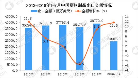 2013年-2015年中国塑料制品出口金额呈增长趋势,2016年中国塑料制品出口金额有小幅度下降;2018年1-7月中国塑料制品出口金额为24087.9百万美元,同比增长11.5%。