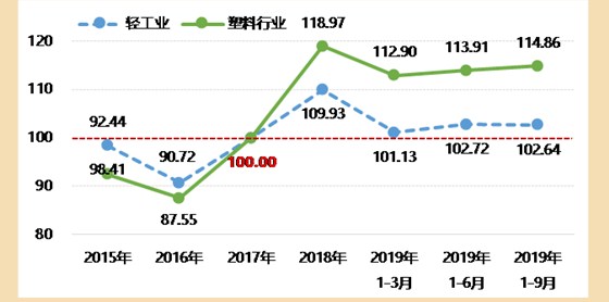 2019年前三季度塑料制品行业对美累计出口额为126.3亿美元。塑料制品行业中美出口贸易指数在2019年持续保持在相对高位运行,且随着美国对部分塑料制品已加征关税商品进行排除等利好因素支撑,行业中美出口贸易指数小幅走高,1-9月该指数为114.86,较1-6月升高0.91点,比同期轻工业中美出口贸易指数高12.22点。