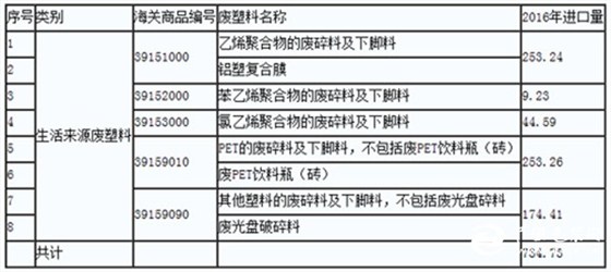 2017年底前调整为禁止进口的生活来源废塑料目录及2016年进口量情况