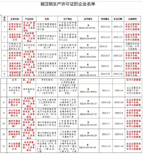 从统计的数据来看,在这12家被撤销生产许可证的企业里,有10家是从事塑包印刷的企业,其中有4家来自东莞市,3家来自中山市,2家来自潮州市,1家来自河源市。