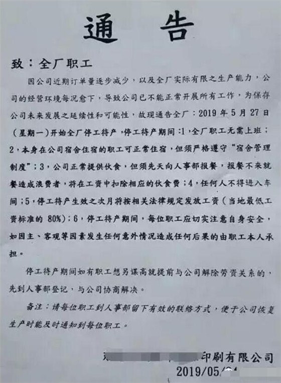 犹记得在上个月底,同样位于东莞地区的另一家印刷企业也发布类似的通告称,近期订单量逐步减少,公司的经营环境每况愈下,不能正常开展所有工作,为保存公司未来发展的延续性和可能性,将从2019年5月27起全厂停工待产。