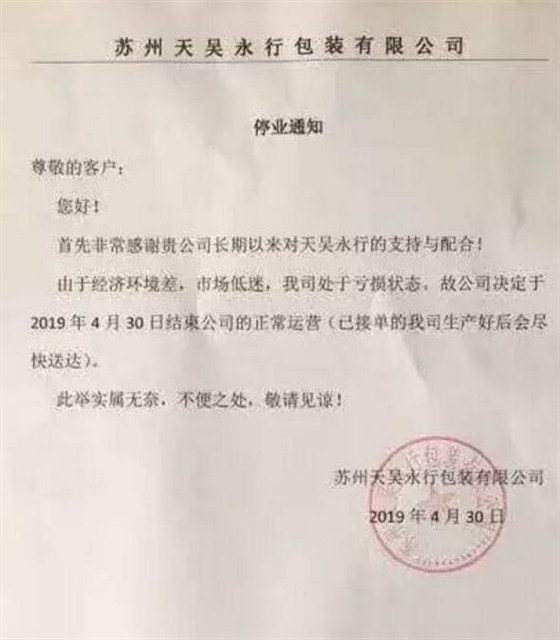 印刷企业如此,纸箱企业亦是如此。在今年4月份的最后一天,江苏省苏州市天吴永行包装有限公司发布停业通知称,由于经济环境差,市场低迷,公司处于亏损状态,只好结束正常运营。