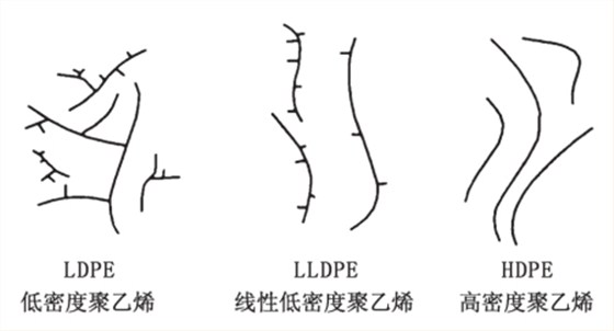 乙烯聚合示意图聚乙烯有三种结构如图所示。低密度聚乙烯分子主链上每1000个碳原子中约带有20~30个乙基、丁基或更长的支链。支链结构的不规则性使低密度聚乙烯结晶性较差,密度低,有良好的化学稳定性、电绝缘性和柔软性,加工性能好,透明性好,但力学性能较差,它不透水,但透气。所以把金鱼放在盛水的聚乙烯薄膜袋中,口袋密封后,金鱼也不会憋死。高密度聚乙烯分子链为线型结构,支链少,平均每1000个碳原子含有几个支链。规整的链结构使高密度聚乙烯结晶性好,密度高,在化学稳定性、电绝缘性方面与低密度聚乙烯相似,但耐热性更好,硬度和机械强度较高,制成的容器可煮沸消毒。线性低密度聚乙烯与高密度聚乙烯有相似的线性结构,但线性低密度聚乙烯引入的少量α-烯烃使其分子链上形成一定长度的无规则分布的短支链,从而结晶性较差,熔点比低密度聚乙烯高10~15℃,耐热性和耐低温冲击性优良,机械性能比低密度聚乙烯好,强度相同时,线性低密度聚乙烯制品可以减薄。