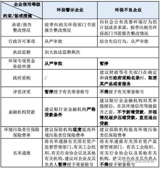 企业被处罚的行为属于将企业直接评为不良环保企业“一票否决”情形或者企业受到的环境行政处罚会影响企业的信用等级评价,使企业成为环保警示企业或者环保不良企业的,则企业会受到下表中对于环保警示企业或环保不良企业的约束性或惩戒性措施。