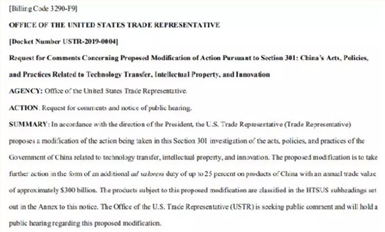 5月13日,美国贸易代表办公室发布公告,将就约3000亿美元中国商品加征25%关税征求意见,这份涵盖3805种产品的征税清单包括大量鸡鸭牛羊肉等农产品以及假发、手套、玩具等日用消费品。