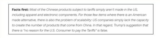 美国有线电视新闻网(CNN)指出,包括服装和电子元件在内,当下关税针对的大多数中国产品并非在美国制造。美国企业缺乏生产出与从中国进口产品同等数量产品的能力。