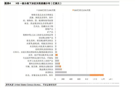 2018年6月15日,美国正式公布加征25%关税的中国商品清单,包括1102种产品,总额500亿美元。从7月6日第一批落地的360亿美元清单看,主要集中在机械设备、电子设备、运输设备、医药等高端制造业,这表明第一轮征税范围主要集中在高端制造业。