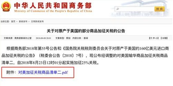 340亿后,美国又对160亿美元中国进口商品征25%关税,美方的清单包含了6月15日公布的284个关税项目中的279个,包括摩托车、蒸汽轮机等产品,使中美贸易战进一步升级。