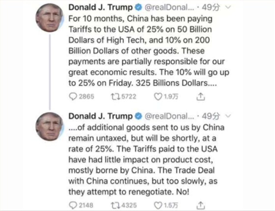 美国当地时间5月5日周日下午,特朗普用推特宣布,从5月10日开始,美国会对价值2000亿美元的中国商品增收关税;另外目前未征税的3250亿中国输美商品也将被开征25%的关税。