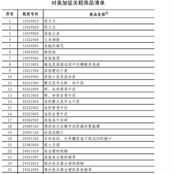 中国立刻回应美国关税清单,对原产于美国的大豆等农产品、汽车、化工品、飞机等进口商品对等采取加征关税措施,税率为25%,涉及2017年中国自美国进口金额约500亿美元。