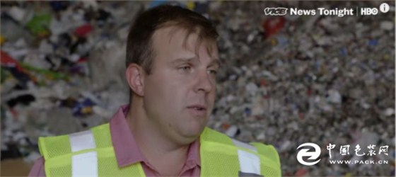 接下来,节目采访了几个美国垃圾回收企业的负责人,请他们吐槽中国拒绝接收美国的垃圾给他们的生意带来的影响。比如下面这位名叫B.J Harvey的企业负责人就表示,中国曾经是他们90%的垃圾的目的地,可自从中国的洋垃圾禁令后,这些垃圾便无处可去了。