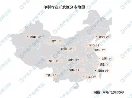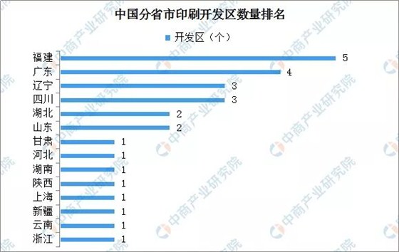 按开发区数量来看,拥有印刷开发区数量最多的省市为福建省,合计达5个;其次为广东省,印刷开发区数量为4个;辽宁省、四川省拥有印刷开发区均为3个;湖北省、山东省印刷开发区各有2个;甘肃、河北、湖南、陕西、上海、新疆、云南、浙江各1个。