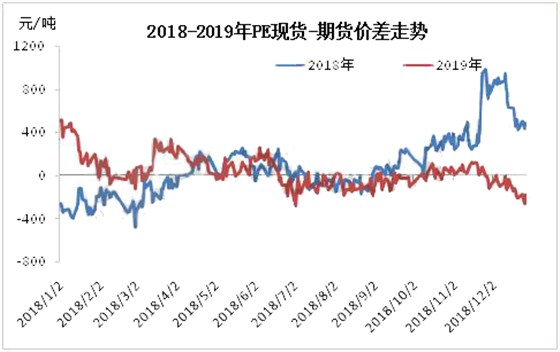 2019年中国PE期现基差范围较2018年缩窄,以华北煤化工7042价格与LL主力合约结算价基差来看,全年升贴水范围在520元/吨以内,且基差多处于正值。2019年中国PE市场供需压力加大,7-9月,中美贸易摩擦升级,市场担忧情绪加重,现货价格弱势下行,并跌破十年历史低位,此阶段现货端压力大于期货,基差处于负值。