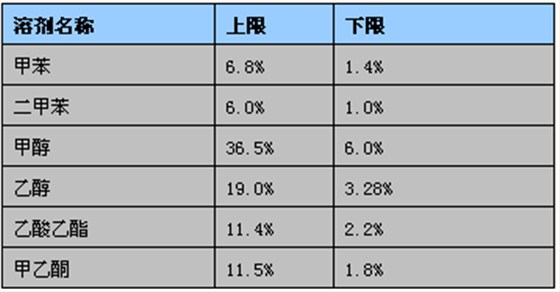 表1列出了几种常用溶剂的可爆燃范围。为了避免爆燃,使用循环风,不断地向凹印机的干燥装置输送空气,控制可燃气气体量在爆燃下限的1/2以下。