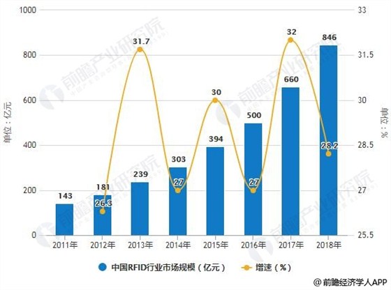 事实上,目前智能包装细分市场规模最大的就是RFID市场。2011-2017年,中国RFID行业市场规模高速扩张,年均复合增速高达24%;预计2018年中国RFID行业市场规模达到846亿元左右。