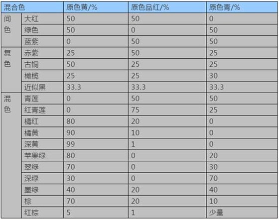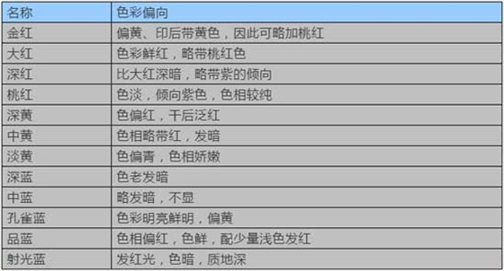 另外,色相差异应以异色油墨混合,饱和度差可以加入透明油墨调整,在三原色墨当中,各色墨的加入量,即相互比例非常重要,可获得一系列颜色如: