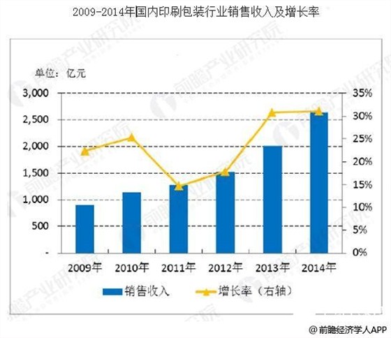 据前瞻产业研究院《中国包装行业市场前瞻与投资战略规划分析报告》数据显示,我国包装印刷行业销售收入自2009年以来呈现逐年上升的趋势。2014年我国包装印刷行业的销售收入突破2600亿元。