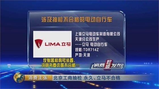 上海立马电动车制造有限公司天津分公司生产的立马电动自行车,反射器和鸣号装置、说明书要求等不合格。