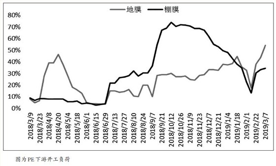 需求方面,春节之后聚乙烯进入消费旺季,下游农膜开工负荷明显回升。截至3月10日当周,国内农膜企业开工率在43%左右,环比上升4%。特别是随着北方春播的展开,地膜的开工负荷显著回升,市场对于LLDPE的需求明显增加。不过,由于目前聚乙烯的市场走势相对较弱,下游企业采购并不积极,仍然采用高频低买策略,市场没有出现大规模的备货行情。
