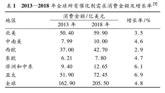 近年,在亚太及非洲和中东地区,包括炼油、聚合、化学合成等在内的所有催化剂需求消费金额及增幅均高于欧美发达地区(见表1) 。