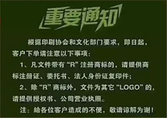 浙江义乌市政府相关负责人提醒:各印刷厂负责人应增强责任感,守牢法律底线,严格按照印刷行业五项制度开展工作。今后在承印所有包装装潢印刷品时,必须要对方提供商标注册证、委托书、营业执照复印件等,个人的话需要委托书及身份证复印件等。并妥善留存验证的各种证明文件2年,以备出版行政部门、公安部门查验。