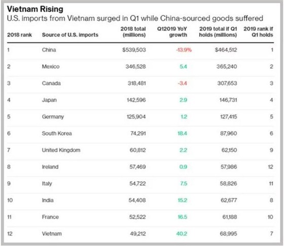 在贸易战背景下,今年第一季度中国对美出口下降13.9%;上月包括日本、韩国、新加坡和台湾等区域主要经济体对美出口也都出现下滑,而越南上月对美出口同比增长7.5%。